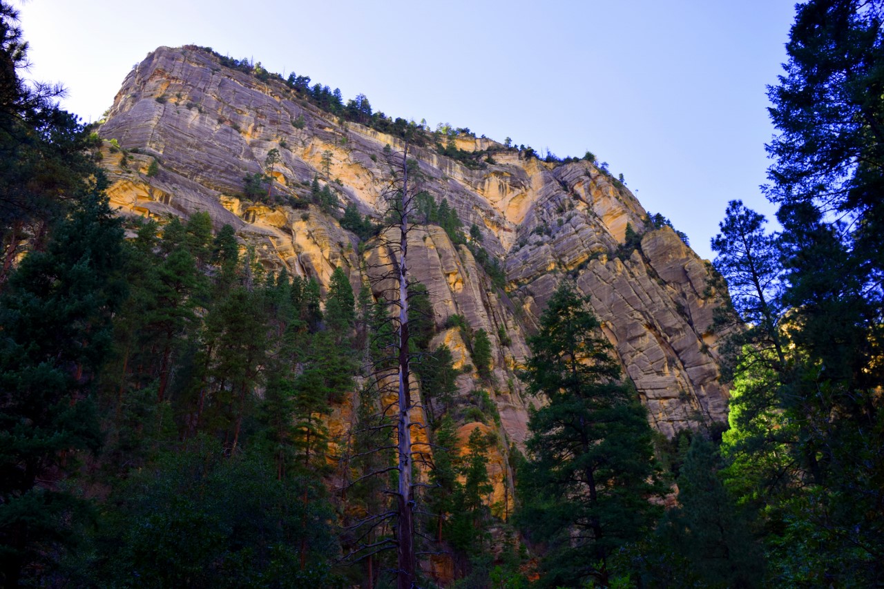 | West Fork of Oak Creek Trail West Fork Trail is touted to be one of the best trails in Arizona and one of the top 10 trails in the United States. The trail is approximately 6 miles round trip and is rated easy. Although, there are a few areas where short uphill stepping stones are used. There are also numerous stream crossings (at least 13) which are done with stepping stones and logs. At the end of the trail a pool of water surrounded by cliffs is encountered. Passage from this point requires wading in water. It is possible to travel another 11 miles upstream requires boulder hopping, wading and even some swimming. This extended hike is an overnight adventure. |