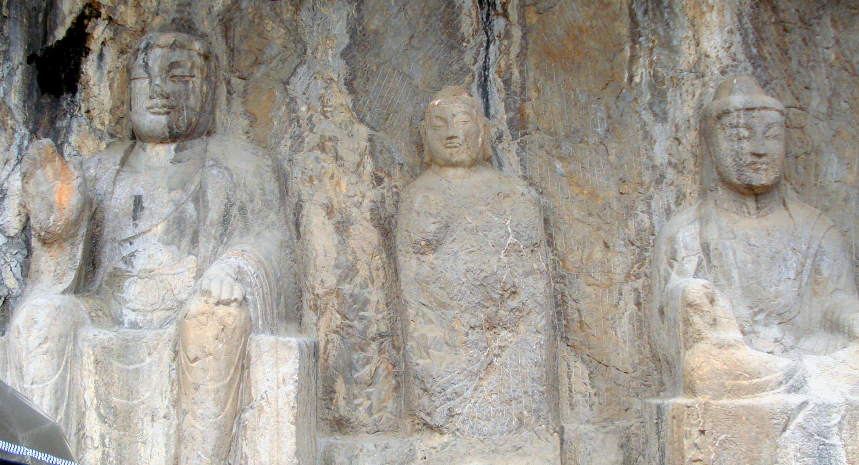 | Feng Xian Si, or Li Zhi cave is the Ancestor Worshipping Cave, which is the largest of all caves carved on the west hill built between 672 and 676 for Empress Wu Zetian. The carvings are claimed to be the ultimate in architectural perfection of the Tang dynasty. The shrine inside the cave measures 39m x35m. It has the largest Buddha statue at the Longmen Grottoes. Of the nine huge carved statues, the highly impressive image of Vairocana Buddha is sculpted on the back wall of the Fengxian. The image is 17.14m high and has 2m long ears. An inscription at the base of this figure gives 676 as the year of carving. Bodhisattva on the left of the main image of Buddha is decorated with a crown and pearls. Also shown is a divine person trampling an evil spirit. The main image of Vairocana's features are plumpish and of peaceful and natural expression. Each of the other large statues are carved with expressions matching their representative roles. These were carved at the orders of Empress Wu Zetian, and are considered uniquely representative of the Tang dynasty's "vigorous, elegant and realistic style." The huge Virochana statue is considered as "the quintessence of Buddhist sculpture in China." |