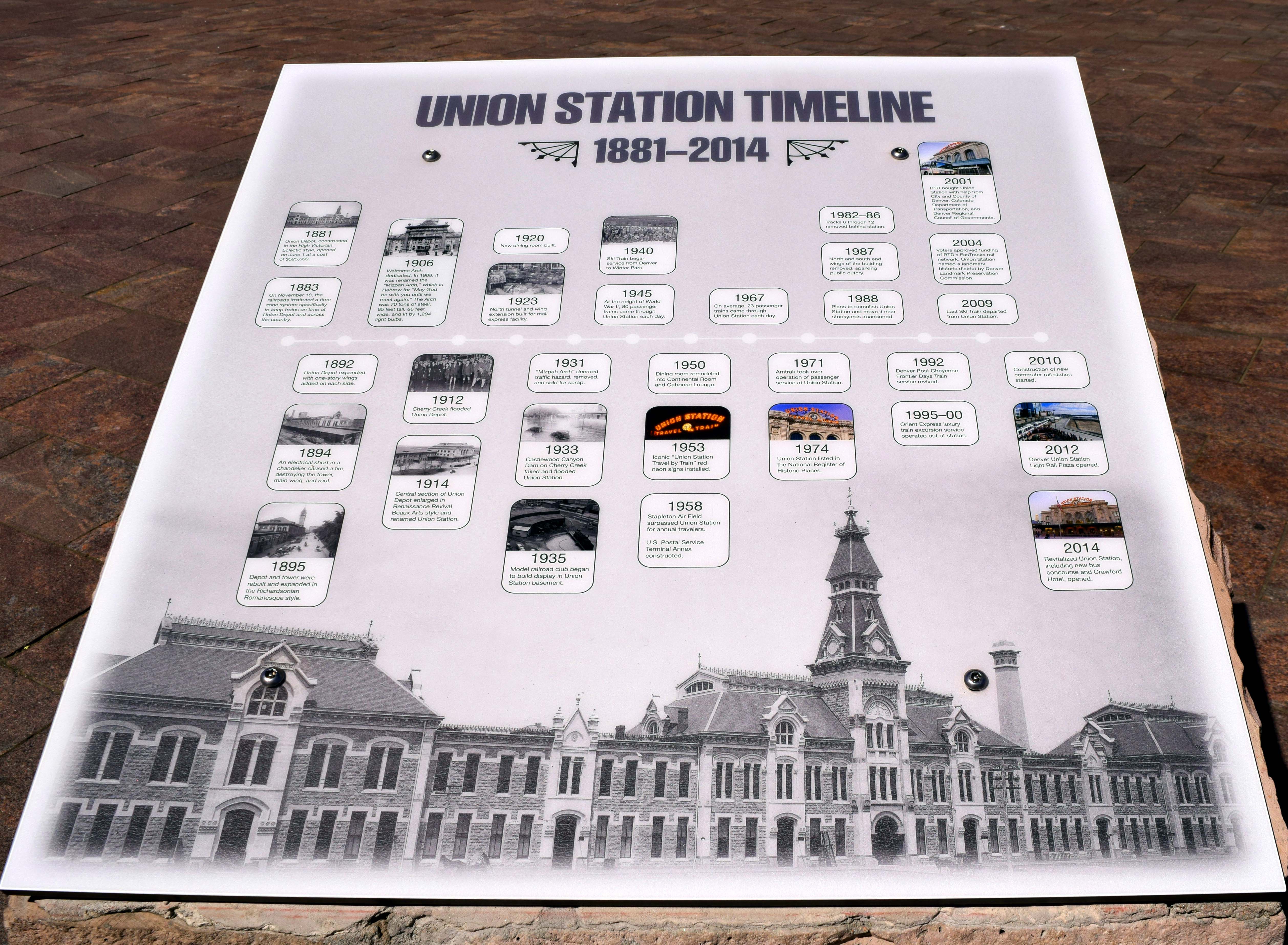 UNION STATION Denver Union Station is the main railway station and central transportation hub in Denver, Colorado. It is located at 17th and Wynkoop Streets in the present-day LoDo district and includes the historic terminal building, a train shed canopy, a 22-gate underground bus facility, and light rail station. The building first opened on June 1, 1881 with its present-day structure completed in 1914. In 2012, it underwent a major renovation in order to redevelop it as the centerpiece of a new transit-oriented mixed use development on the site's former rail-yards. The building re-opened in the summer of 2014 with the addition of the Crawford Hotel, several restaurants and retailers, and a train hall.