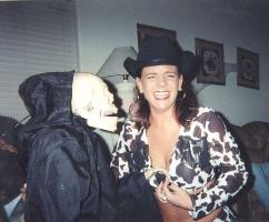 | Cowgirl Leigh is boning up with the Grim Reaper |