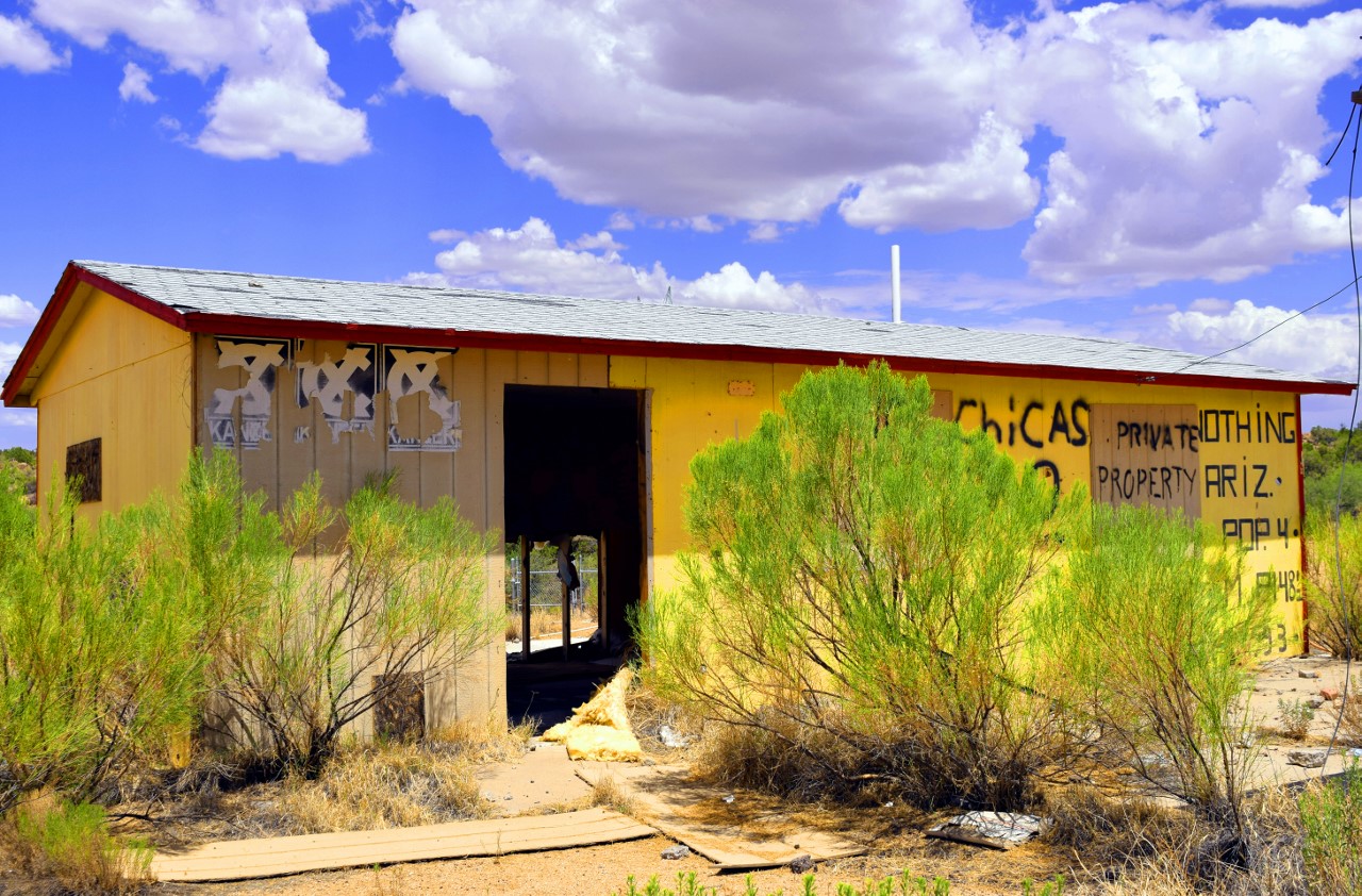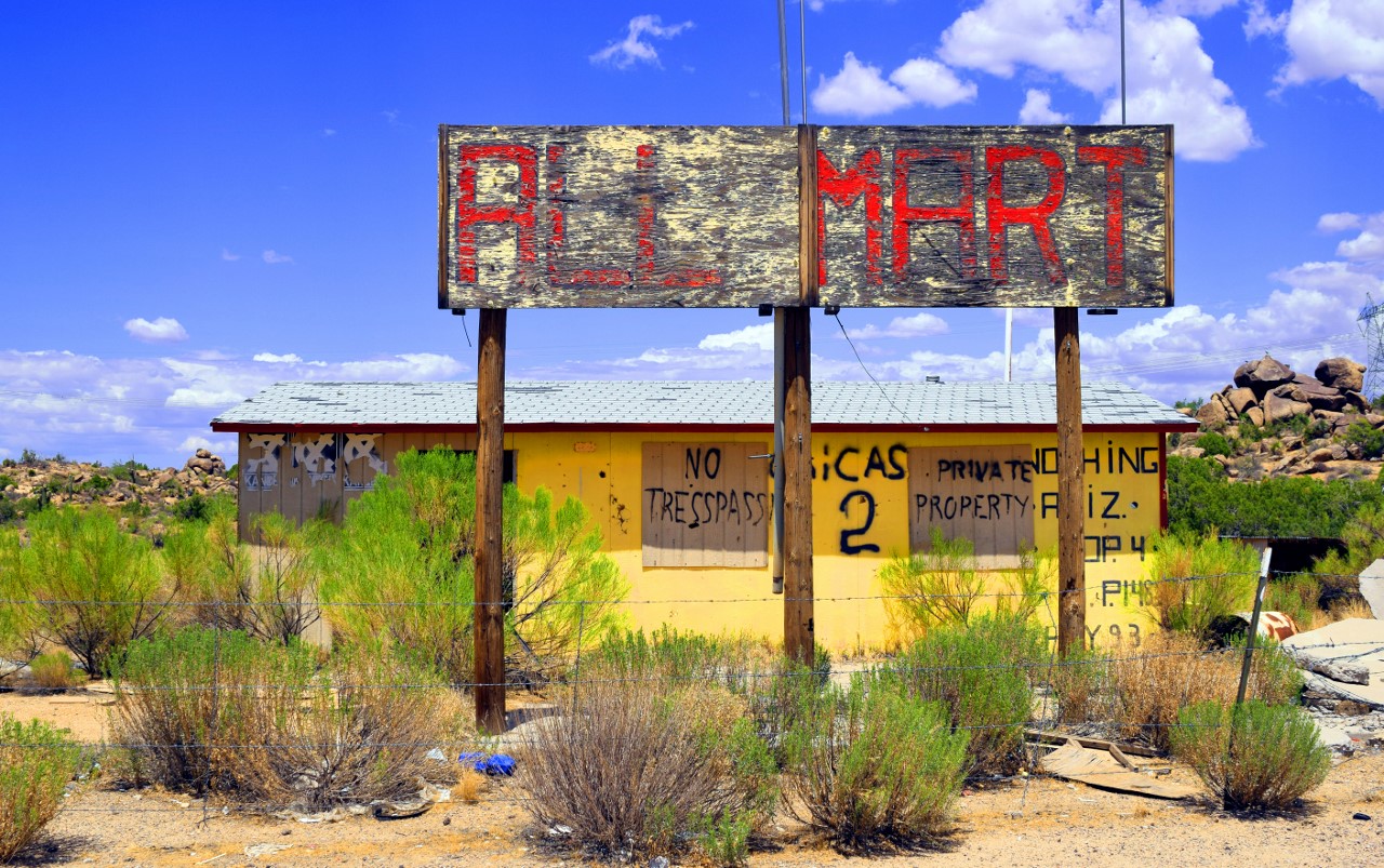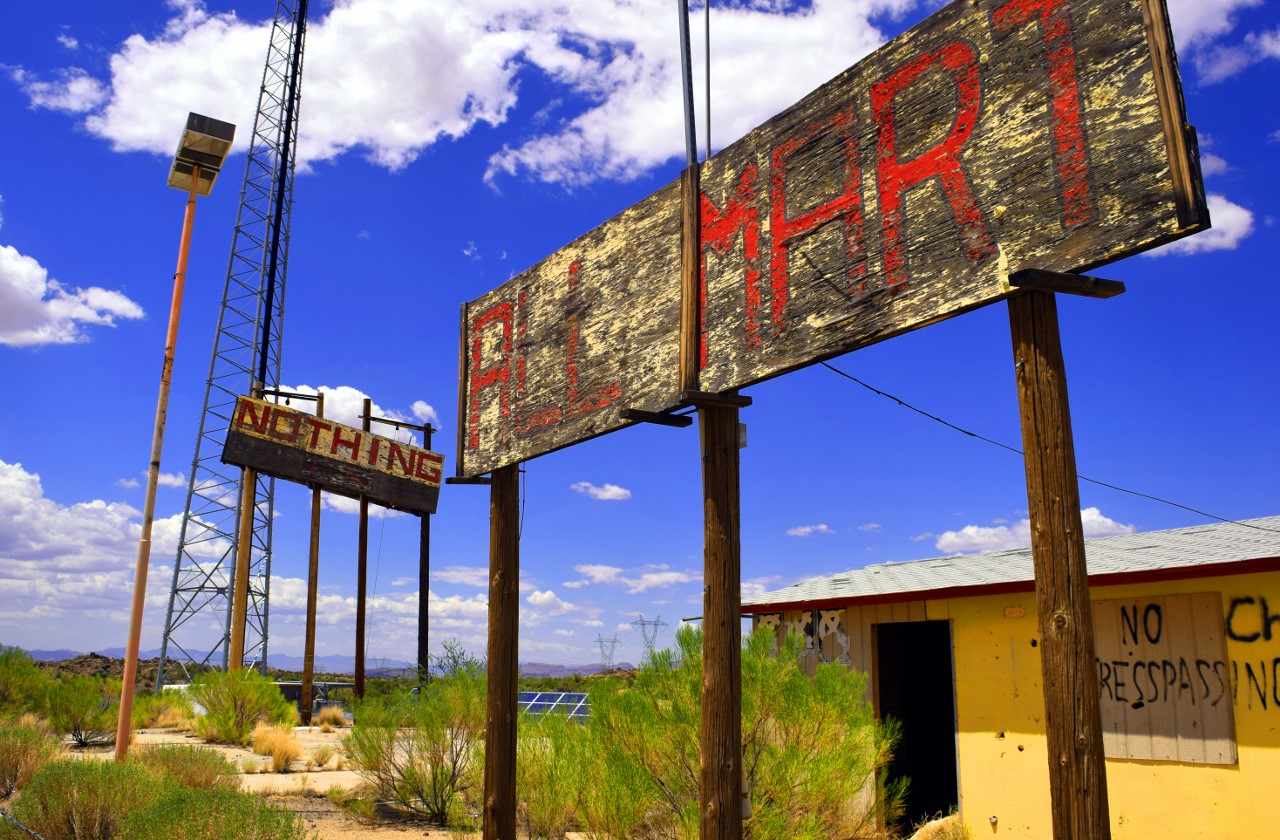 | The locals told travelers it "got named by a bunch of drunks." The settlement was established in 1977, located 100 miles northwest of Phoenix Arizona, and roughly 20 miles south of Wikieup, the "rattlesnake capital of Arizona." It is west of Bagdad at milepost 148½ on U.S. Route 93 (the Joshua Forest Scenic Parkway) between Wickenburg and Kingman, on the route from Las Vegas to Phoenix. Nothing once contained a gas station and small convenience store. Nothing was abandoned by May 2005, and by August 2008, the gas station was beginning to collapse. An attempted revival of Nothing occurred at some time after August 2008 when Nothing was purchased by Mike Jensen. By April 2009, Jensen had opened his pizza business, run from a portable oven, with hopes of reopening the mini-mart and creating accommodations for RVs. As of April 2011, it appears that Nothing has once again been abandoned. The building has fresh boards in the windows, and no sign of inhabitance or any activity. |