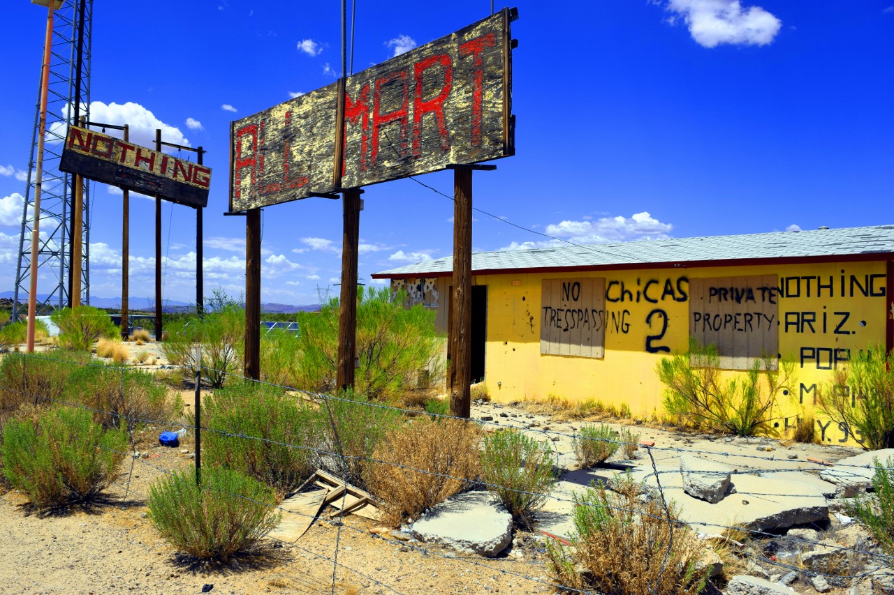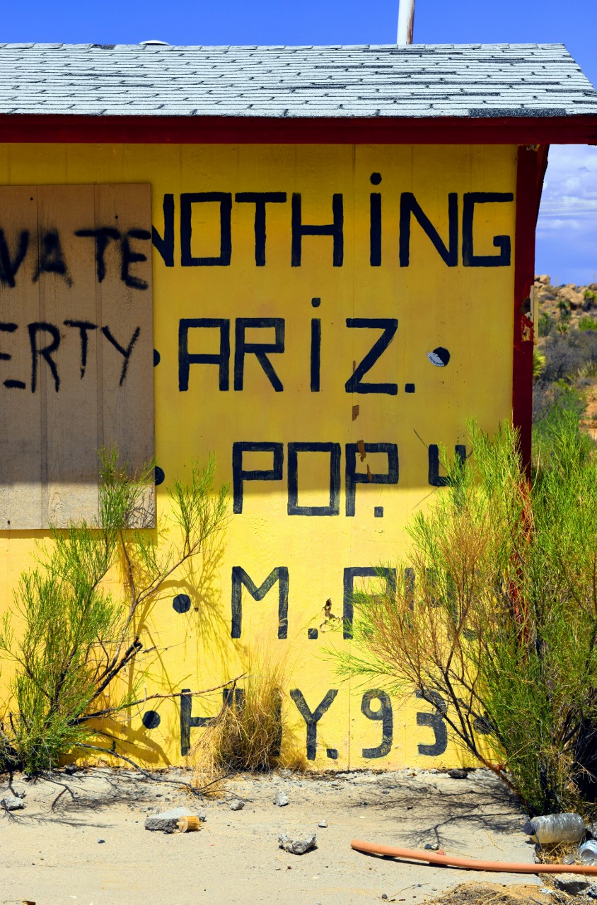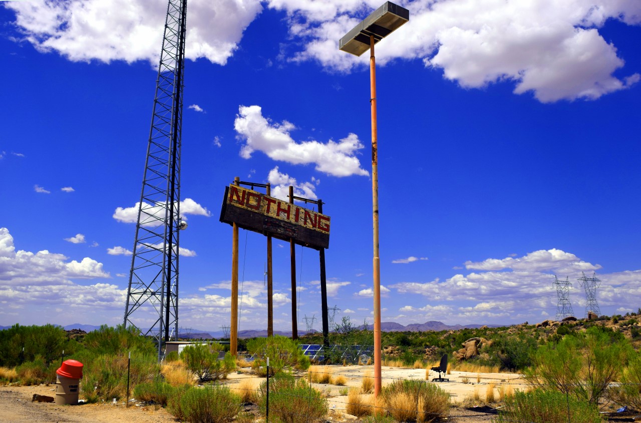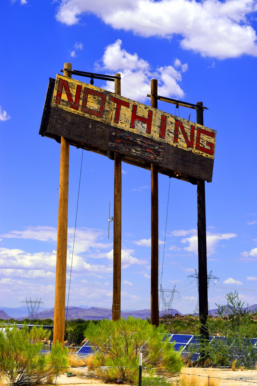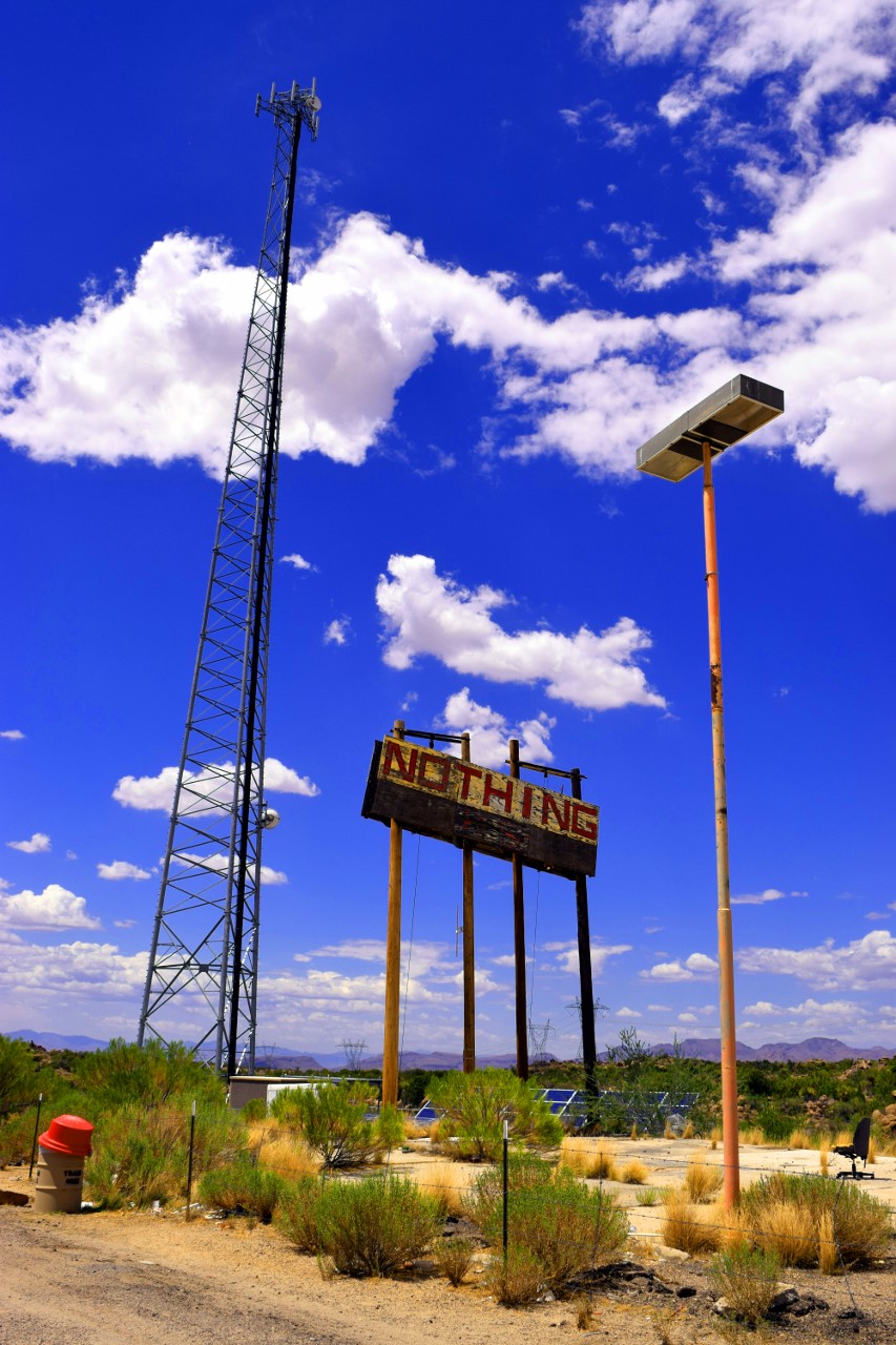 | Nothing is an uninhabited ghost town in eastern Mohave County, Arizona, IT ONCE HAD A SIGN THAT READ: Town of Nothing Arizona. Founded 1977. Elevation 3269ft. "The staunch citizens of Nothing are full of Hope, Faith, and Believe in the work ethic. Thru-the-years-these dedicated people had faith in Nothing, hoped for Nothing, worked at Nothing, for Nothing." |