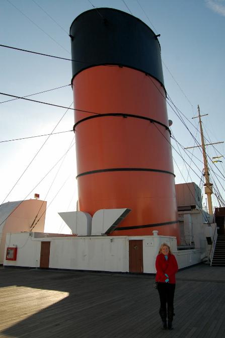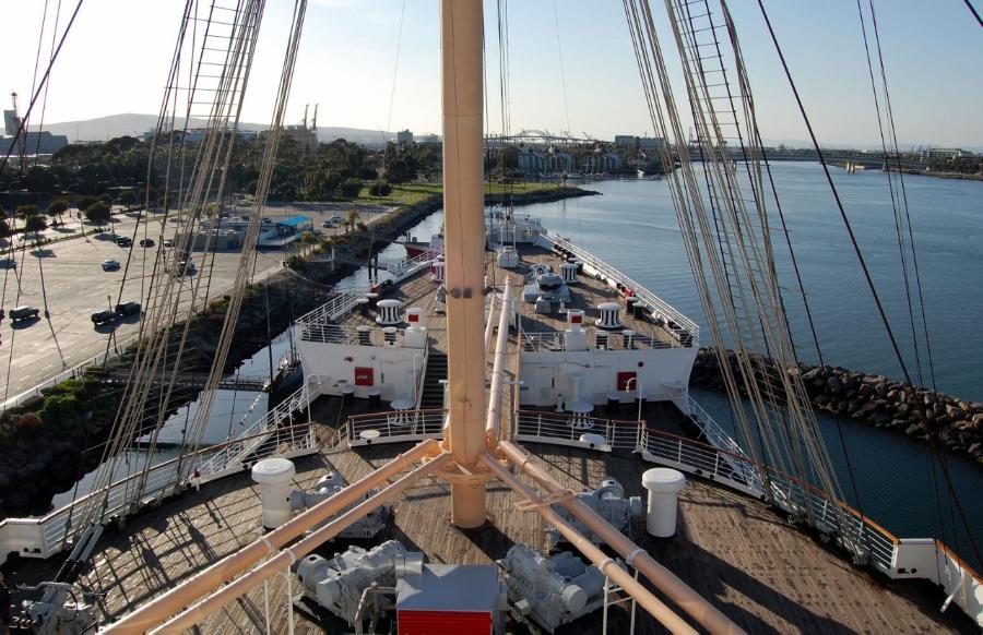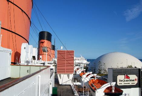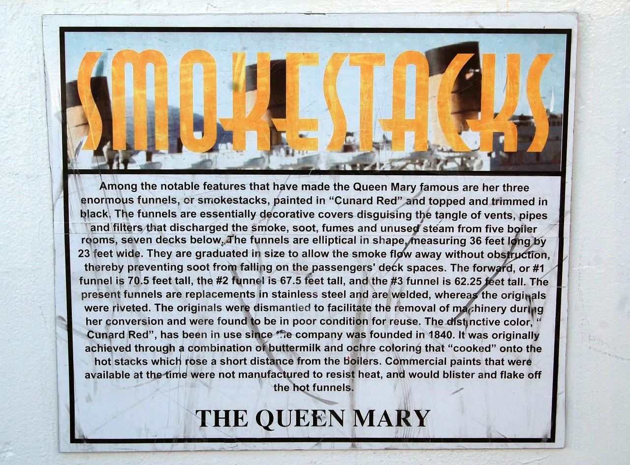 | THE QUEEN MARY Statistics Overall Length: 1,019.5 ft. (310.74 m.) Gross Tonnage: 81,237 gross tons (230,039 cu. m.) Constructed by: John Brown & Co., LTD., Clydebank, Scotland Commissioned by: Cunard Steamship Co., LTD. Keel Laid: December 1, 1930 Date Launched: September 26, 1934 Maiden Voyage: May 27, 1936 Portholes: Over 2,000 Rivets: Over 10 million Hull Plates: 8 ft. (2.44 m) to 30 ft. (9.14 m.) in length; up to 1.25 in. (3.2 cm.) thick Moulded Breadth: 118 ft. (35.97 m.) Height from Keel to Forward Smokestack Top: 181 ft. (55.17 m.) Height from Keel to Promenade Deck: 92.5 ft. (28.19 m.) Height from Keel to Top of Foremast: 237 ft. (72.24 m.) Number of Decks: 12 Height from Keel to Top of Foremast: 237 ft. (72.24 m.) Passenger Capacity: 1,957 Officers and Crew: 1,174 Horsepower: 160,000 Cruising Speed: 28.5 knots (55.17 km./hr.) Rudder: 140 tons Whistles: Three - Steam type. Two on forward funnel, one on middle funnel. Each over 6 ft. (1.83 m.) long, weighing 2,205 LB. (1,002 kg.) Lifeboat Capacity: 145 persons Smokestacks: Three - Elliptical in shape; 36 ft. (10.97 m.) fore and aft, 23.3 ft. (7.1 m.) wide Smokestack Height: Forward: 70.5 ft. (21.49 m.) Middle: 67.5 ft. (20.57 m.) Aft: 62.25 ft. (18.97 m.) Boilers: 27 Fuel Consumption: 13 ft./gal (1 m./l.) Draft: 39 ft. 4-9/16 in. (12.00 m.) Bow Anchors: Two that each weigh 16 tons (16,291 kg.) Anchor Height: 18 ft. (5.48 m.) Length of Promenade Deck: 724 ft. (220.68 m.) Length of Anchor Chain: 990 ft. Weight of Anchor Chain: 45 tons (45.818 kg.) Anchor Chain Link: 2 ft. (61 cm.) long, weighing 224 LB. (101.8 kg.) |