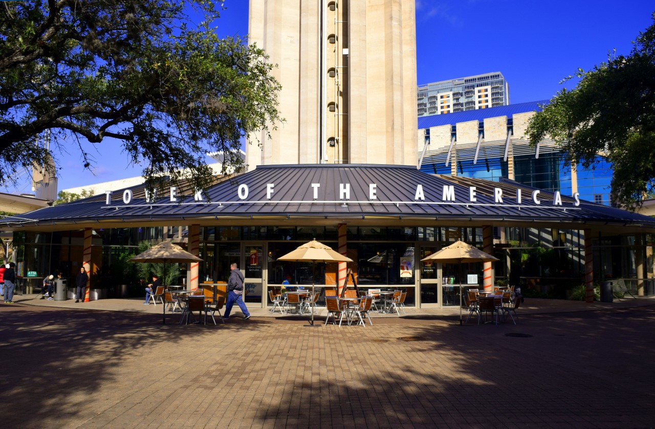 | THE HISTORY OF THE TOWER OF THE AMERICAS The Tower of the Americas is a 750-foot observation tower/restaurant located at HemisFair Park on the southeastern portion of Downtown San Antonio, Texas, United States. The tower was designed by San Antonio architect O'Neil Ford and was built as the theme structure of the 1968 World's Fair, HemisFair '68. The Tower was the tallest observation tower in the United States from 1968 until 1996, when the Las Vegas Stratosphere Tower was completed. It is the tallest building in San Antonio, the 27th tallest building in Texas, and the tallest building in Texas outside of Dallas or Houston. The Tower is located in the middle of HemisFair Park and has an observation deck that is accessible by elevator for a fee. In addition, there is also a lounge and revolving restaurant at the top of the tower that provides panoramic views of the city. The fastest recorded time up the tower's 952 steps is 5 minutes 18 seconds on January 29, 1981. |