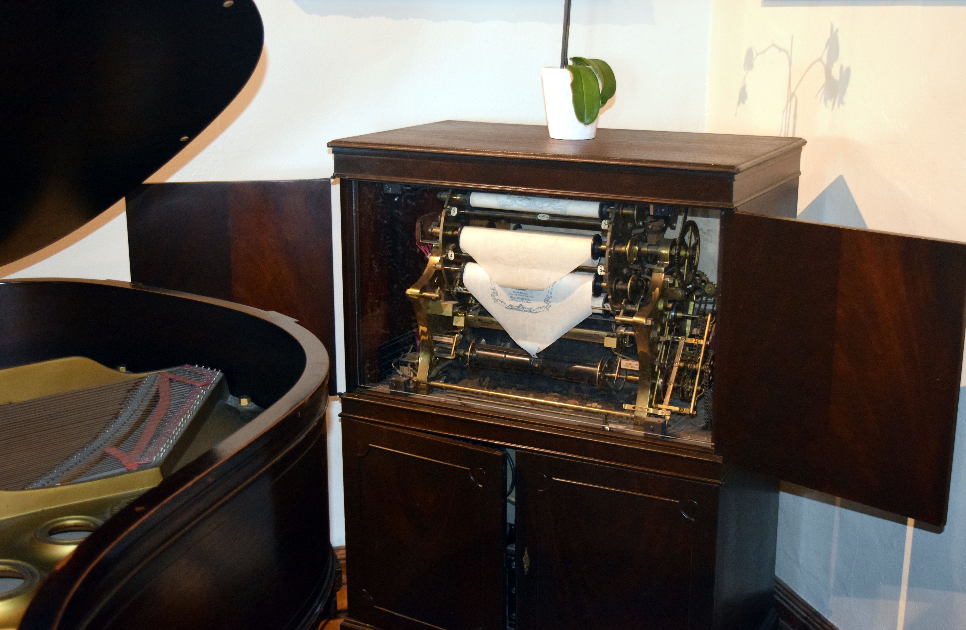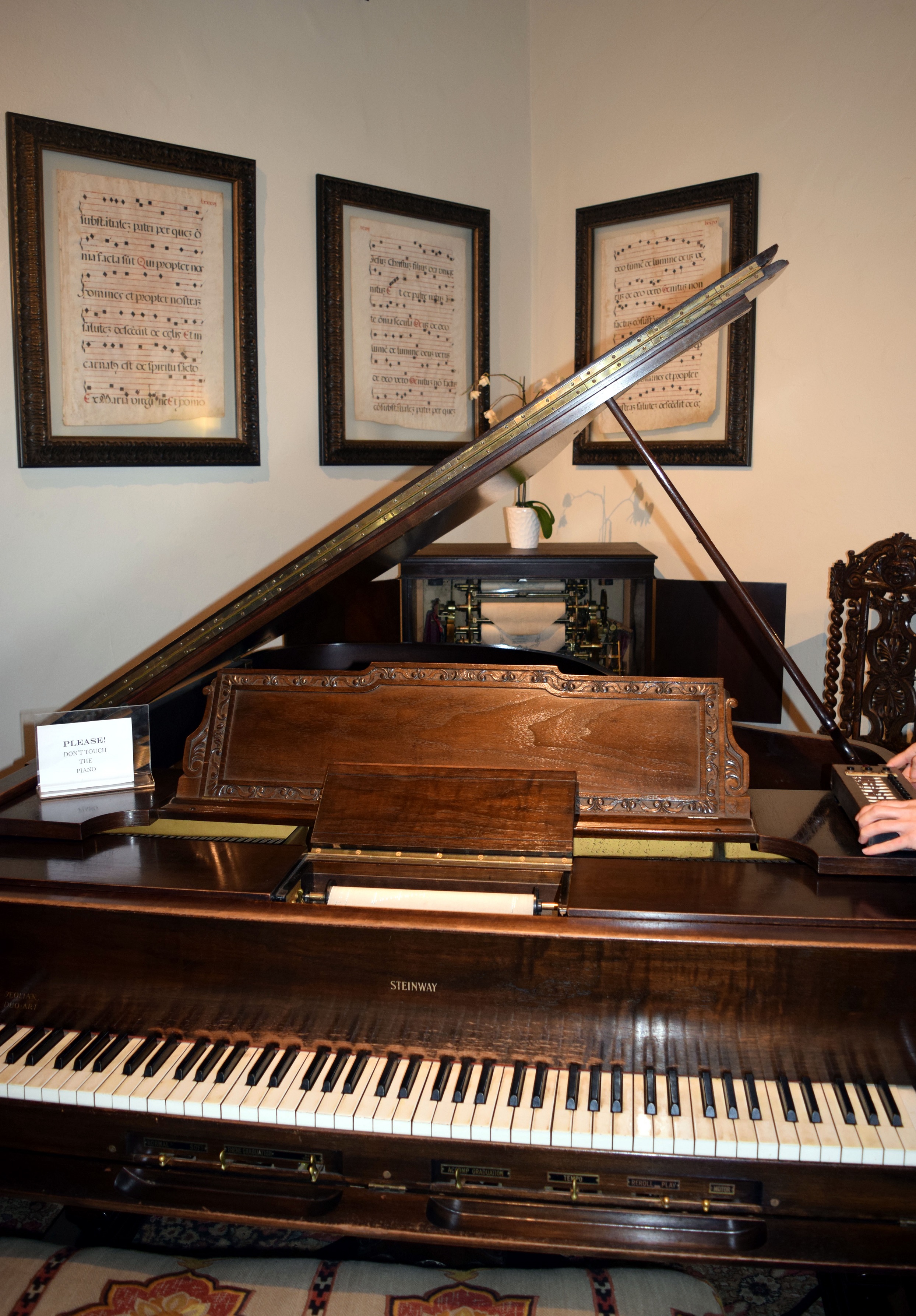 | WRIGLEY MANSION PLAYER PIANO The 1920's era Steinway piano is one of two privately-owned player pianos in existence and is currently worth something like $18M. It plays 12 different Gershwin classics, including Rhapsody in Blue which we got to listen to. Mr. Hormel (the potted meat guy)saved the mansion from the wrecking ball when he purchased the mansion in 1991 for $2.1M. Mr. Wrigley was so fond of the piano that his will stipulated it could never be separated from the home (Liberace had given his son a blank check to try and buy it from Wrigley's son at one point). At the time of his purchase of the mansion, Hormel knew full-well that the piano alone was worth more than the purchase price for the entire estate (William Wrigley spent $1.2M to build it in 1931). |